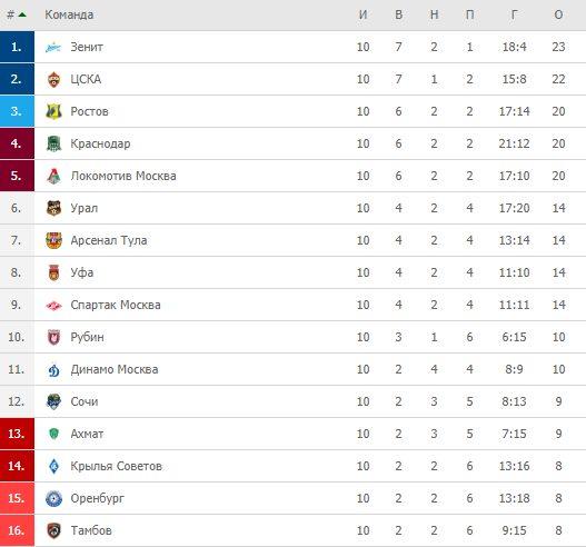 Ровно треть чемпионата позади. По результатам 10 туров в Российской Премьер-Лиге, наконец, появился единоличный лидер. Кроме того, наставник «Спартака» Олег Кононов ещё на шаг приблизился к своей отставке, а ЦСКА и «Краснодар» после 5 пропущенных мячей от клубов из средних европейских чемпионатов в Лиге Европы встретились друг с другом.