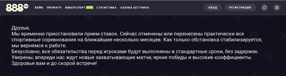 Некоторые конторы самостоятельно принимают решения о временной приостановке деятельности. Одной из таких компаний стала БК «888.ru», которая перестала принимать ставки.
