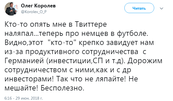Данное резкое высказывание вызвало целую бурю негодования в интернет-сообществе. После скандала, моментально разлетевшегося по сети, твит Олега Королева быстро исчез и был добавлен новый, якобы намекающий, что аккаунт в данной социальной сети был взломан и кто-то захотел подпортить отношения между Германией и Россией.