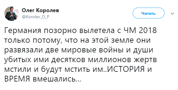 После поражения сборной Германии на Чемпионате мира по футболу—2018 в России от Южной Кореи (0:2) европейская команда заняла 4 место в группе и покинула турнир. Глава администрации Липецкой области прокомментировал сложившуюся ситуацию в своем твиттере, объяснив провальное выступление немцев на российском Чемпионате мира местью миллионов убитых людей, которые погибли здесь от войн, развязанных Германией.