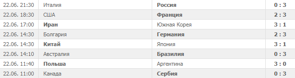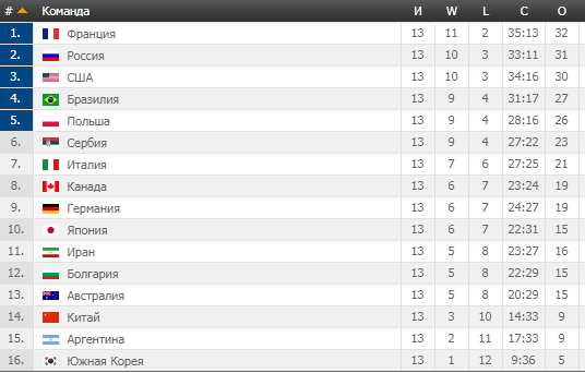 Поражение Японии от аутсайдера Китая лишило страну восходящего солнца шансов на попадание в «Финал шести». В свою очередь, китайцы благодаря этой победе отдалились от Южной Кореи, которая находится на последнем месте и, скорее всего, будет играть стыковые матчи за право сохранить прописку в элитном дивизионе. Поражение Болгарии в пятисетовом матче с Германией отодвинуло бело-зелено-красных на 12-ю строчку, а Иран, не без проблем переигравший Южную Корею, поднялся на позицию выше.