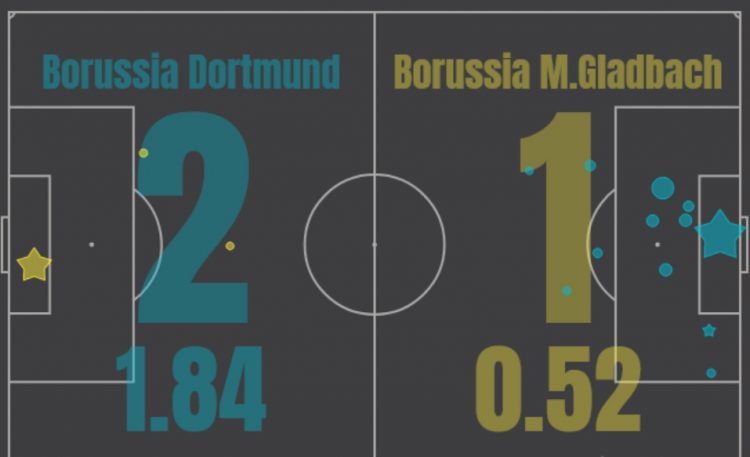 Под конец тайма «Боруссия Дортмунд» нашла все же возможность забить. В стремительную контратаку убежали Ройс, Гетце и Санчо. Казалось, что уже момент запороли, т.к. вернулись защитники, но Гетце отдал мяч Санчо, а тот сильно сместился к лицевой линии, но с острого угла не промахнулся по воротам — 1:0.
