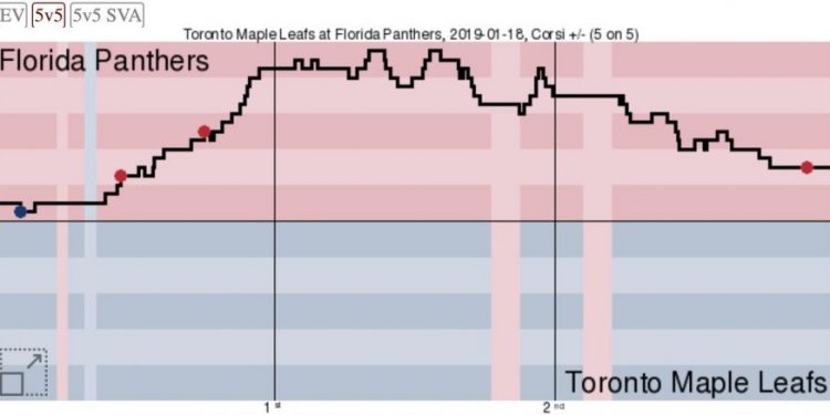 Эти опасения сбылись. Хотя гости начали очень резво, будто и не заканчивался матч против «Тампы», уже на 2-й минуте открыв счет. Бросок защитника Рона Хэйнси от синей линии оказался результативным. Однако в дальнейшем сказалась усталость гостей, которые играли второй день подряд. Достаточно взглянуть на график Корси. «Листья», живущее атакой, так уступили в инициативу сопернику.