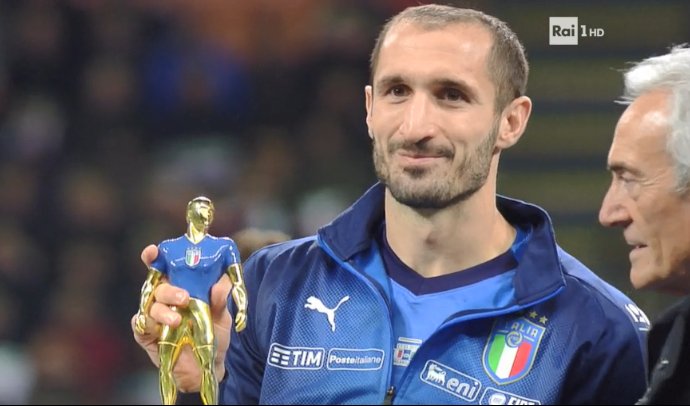 Перед началом матча Кьеллини получил свою скромную награду за достижение в 100 матчей за национальную сборную.