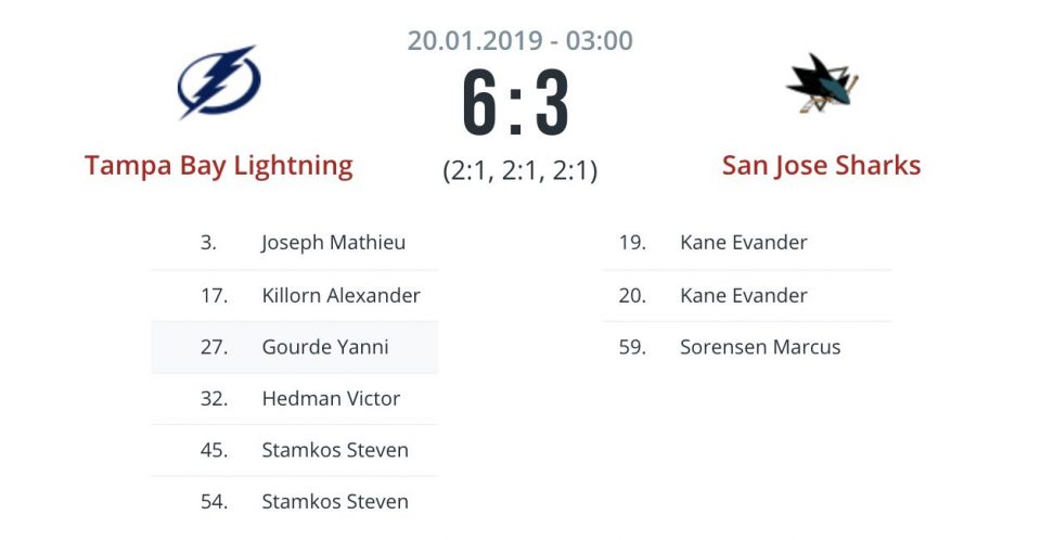 «Тампа-Бэй Лайтнинг» на мажорной ноте входит в All Stars паузу, в красивом матче обыграв сильного соперника в лице «Сан-Хосе». Андрей Василевский отразил 36 бросков, Стивен Стэмкос набрал 3 очка результативности, 2 шайбы и передача.