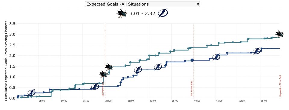 Действительно, глядя на статистику вряд ли можно быть довольным на месте наставника «Тампы». Выше уже отмечалось большое преимущество «Сан-Хосе» по Корси, то есть они были более агрессивны в атаке. Если взять показатель потенциальных голов, то и по нему преимущество у гостей.