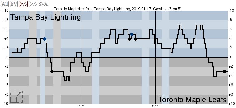 Хозяева площадки начали игру активно и первую половину первого периода прилично поддавливали соперника. Хоккеисты «Торонто» выглядели какими-то сонными, не получалось начать атаку, не правильные решение принимались в средней зоне. Эти границы доминирования «Молний» хорошо видны на графике распределения Корси. Как раз на его пике был открыт счет Брейденом Пойнтом.