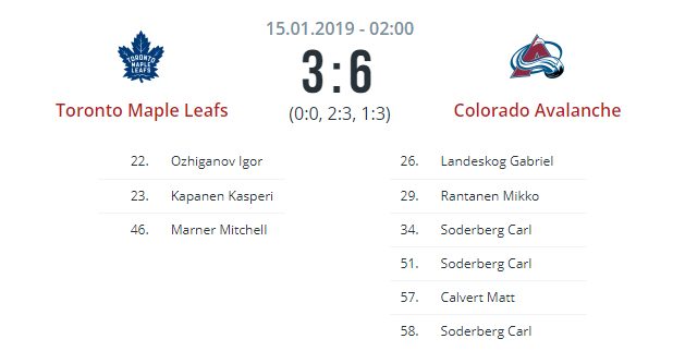 Неожиданно «Торонто Мэйпл Лифс» потерпел поражение в третьей домашней игре подряд. Подопечные Майка Бэбкока играли против команды, у которой до этой встречи было 9 поражений в 10 матчах и считались явными фаворитами. Однако, у «Колорадо» здорово сыграло не только первое звено, а все четыре, что и привело к победе, а форвард 3-й тройки нападения Карл Содерберг оформил хет-трик.