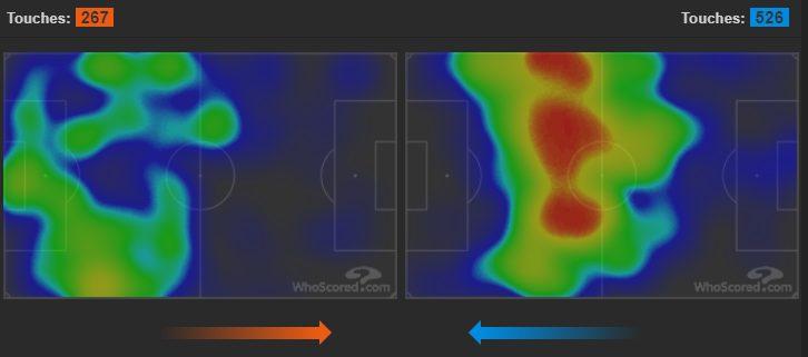 К вашему вниманию тепловая карта обеих команд, а также обратите внимание на количество передач. 267 против 526 в пользу испанского клуба и всего лишь 1 удар!