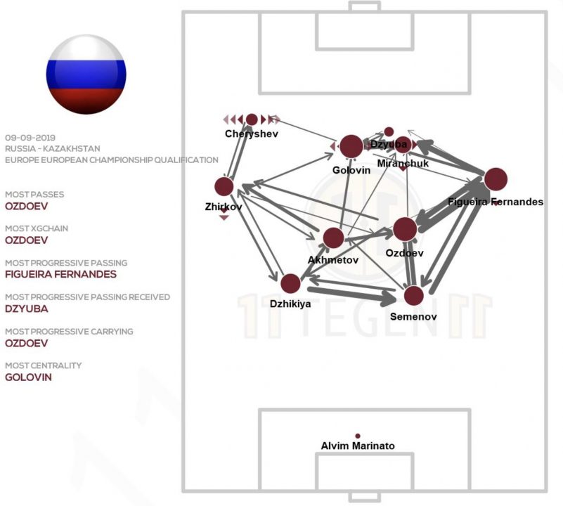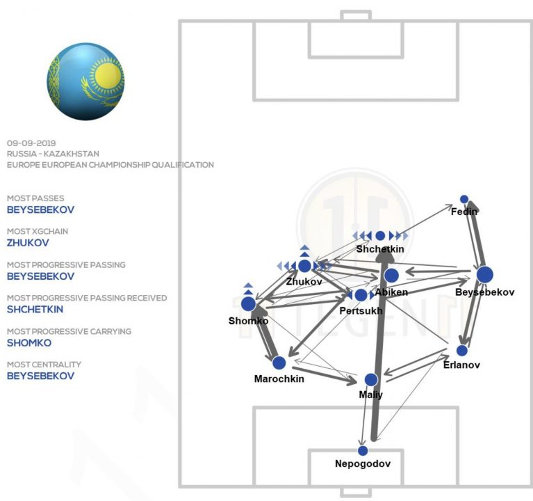 Если обратиться к карте передач сборной Казахстана, то можно увидеть, что самым популярным пасом является длинная передача от своих ворот на единственного форвард Щеткина.