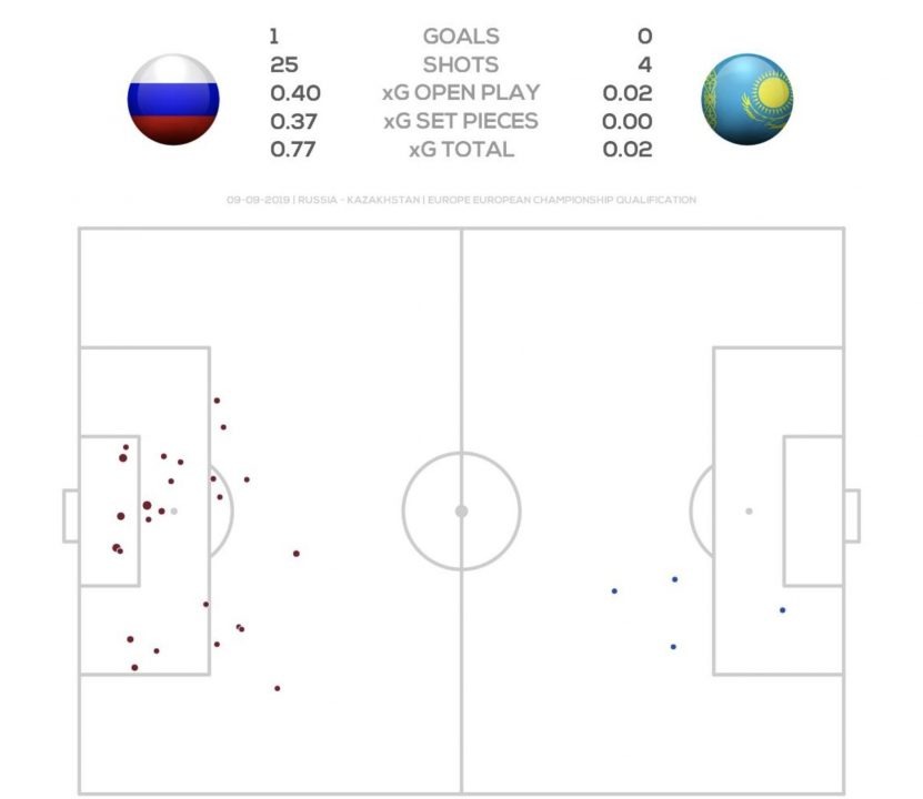 Вязкая и острожная игра Казахстана просто не способствовала результативной игре. Показатели потенциальных голов получились крайне низкими, у Казахстана он вообще практически нуля равен (0.02).