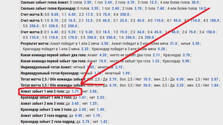 Прогноз «Ахмат» забьет 1 или 2 гола: да — 1.71 (Parimatch)