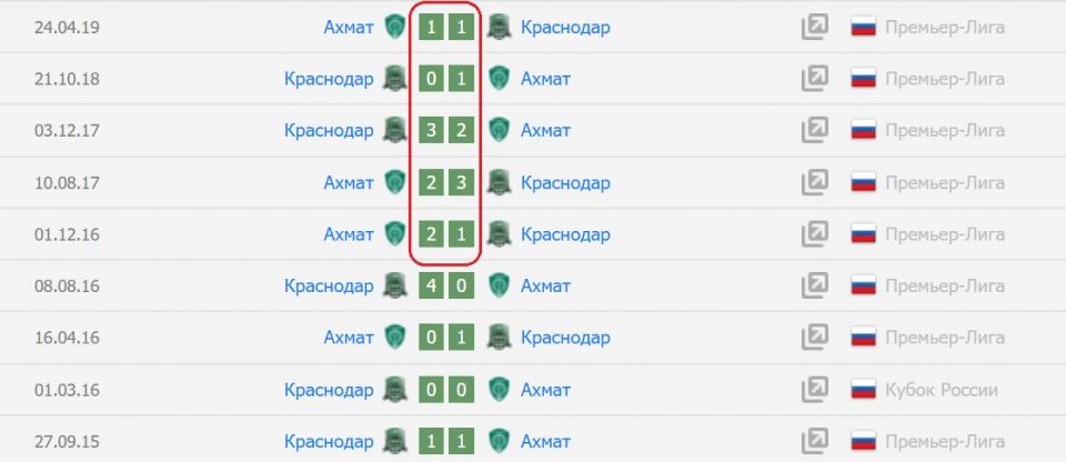 Команды встречаются не в первый раз. Обратите внимание на пять последних поединков: в каждом из них «Ахмат» отличился забитым мячом. Более того, начиная с конца 2016 года «Краснодар» пропускает гол (1-2) на выезде.