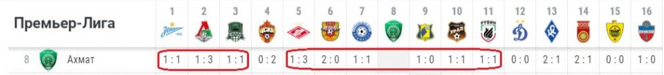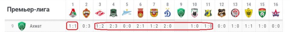 Обратите внимание на выделенные результаты красным цветом. «Ахмат» на домашнем стадионе отличился 7 раз из 10 (2017/2018), 8 из 10 (2018/2019). Берем во внимание первые десять команд из турнирной таблицы.