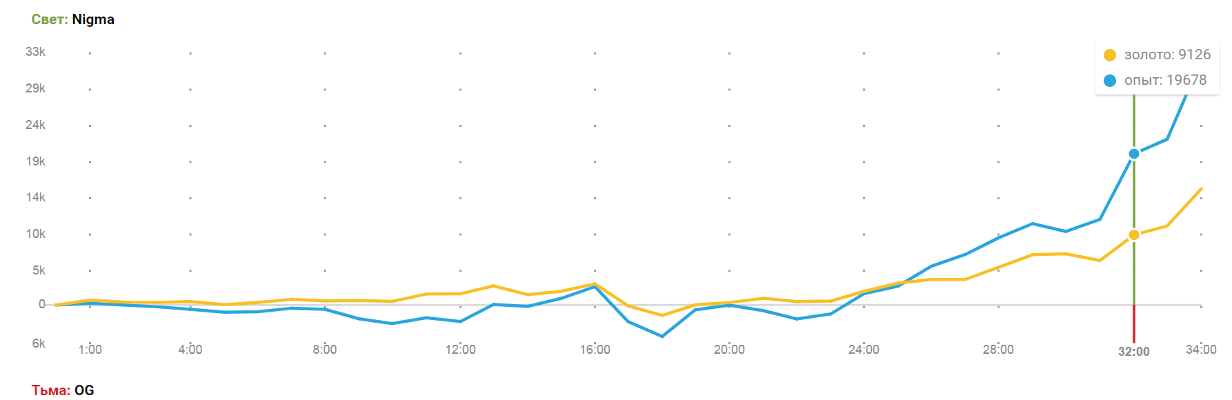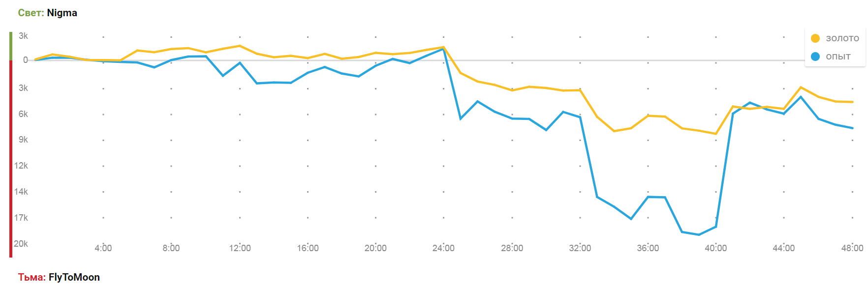 Важно знать! Nigma плохо сыграла в первой карте с FlyToMoon и более-менее с OG. Если в полуфинале соперник принимал, сам навязывал драки и в большинстве случаев их проигрывал, то FTM обязаны были выигрывать 1:0! Обратите внимание на график против украинского коллектива: практически на протяжении всего времени FTM контролировали игру. На 40-й минуте проиграли единственную, но ключевую драку!