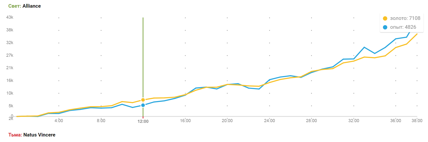 Обратите внимание на график (первая карта с NaVi). Уже на 12 минуте шведы вышли вперед на 7108 золота и 4826 опыта! Против Ninjas in Pyjamas примерно такие же показатели были на 17 минуте!