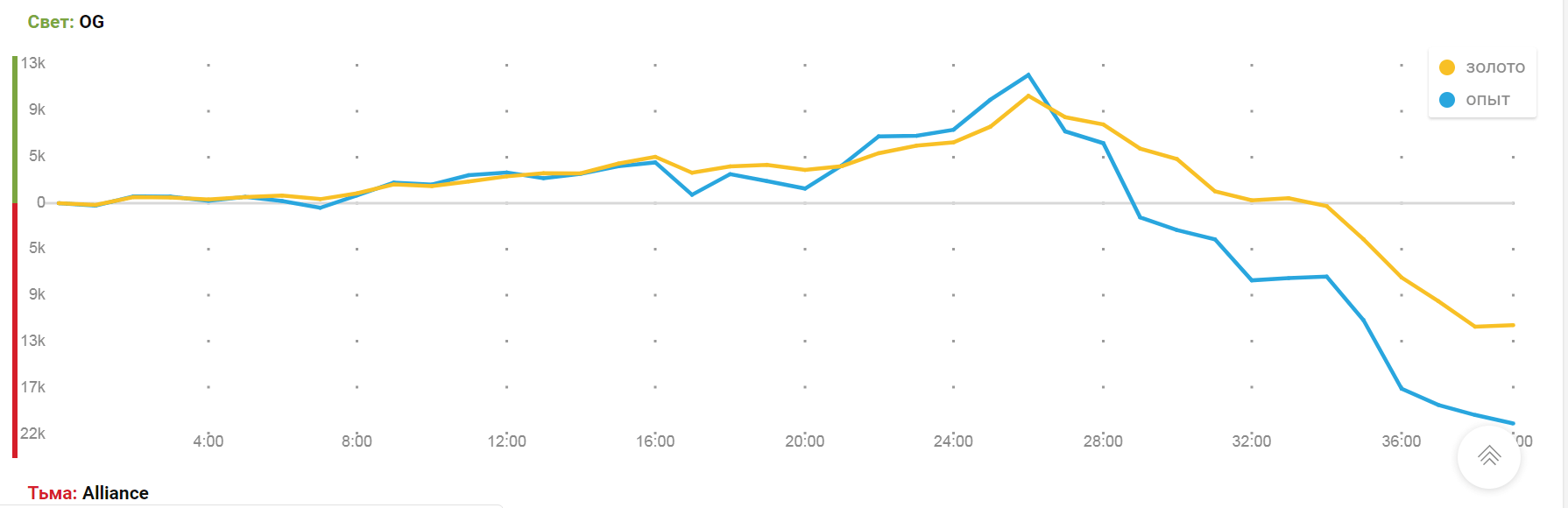 С основой OG выигрыш 2:1, где шведы каким-то чудом выиграли на первой карте, отыграв 14,5 тысяч золота. График изображения. Заслуга здесь не Alliance, а соперника, что позволил сделать камбэк. Также в матчах с Liquid и OG Seed коллектив проиграл первые карты!