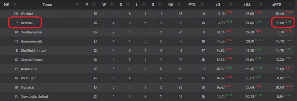 xPTS (ожидаемое количество очков) в АПЛ. По факту «красно-белые» находятся на 7-й позиции в чемпионате. По xPTS должны на 12-й! Обратите внимание на изображение. Команды отсортированы по xPTS, где «Арсенал» занимает 9-ю строчку снизу, то есть 12-ю, если считать сверху вниз.