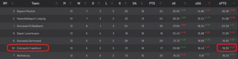 2. xPTS в Бундеслиги. На данный момент первенство занимает 10-ю строчку в чемпионате Германии. По xPTS команда должна находиться на 6 месте!