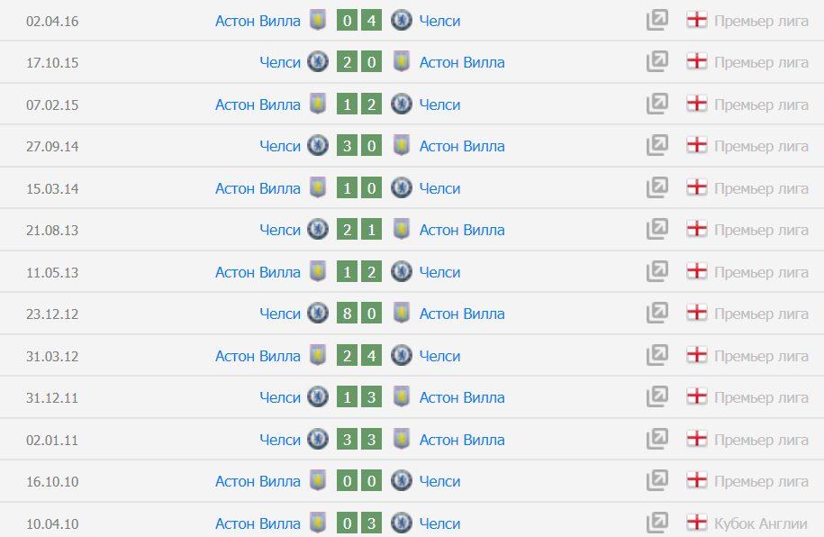 Футбольные коллективы встречались 150 раз. 61 победа у «Чесли», 55 у «Астон Виллы». Разница забитых и пропущенных голов: 236 — 216. В среднем за матч 1.57 — 1.44 . В предыдущих 11 очных встречах «Астон Вилла» смогла забить гол в 7 играх!