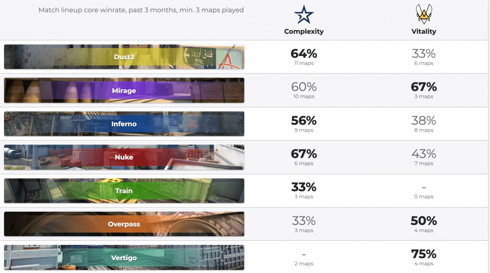 Vitality считаются легкими фаворитами в этом матче. Тем не менее, их форма ужасна, они выиграли только 1 из 5 последних игр. Маппул также не на их стороне в этом матча. Nuke, как правило, является их первым выбором, но Complexity очень прилично выступают на Nuke и, по статистике, даже лучше, чем Vitality.