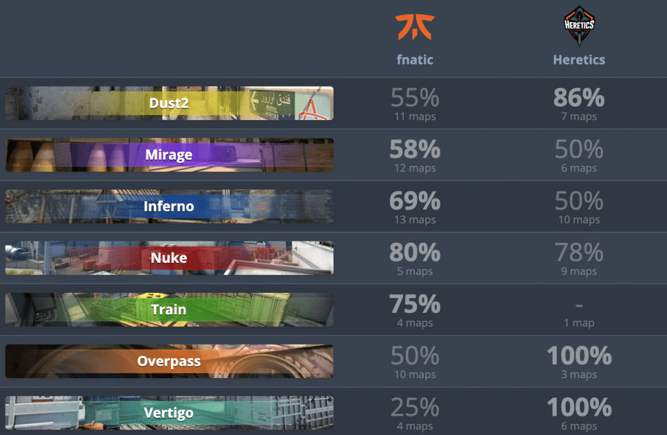 Сложно задумываться о победе над Fnatic, даже несмотря на их последние неудачи, но оценить возможность взятия своего пика Heretics стоит обязательно. Для этого детальнее взглянем на пул карт.