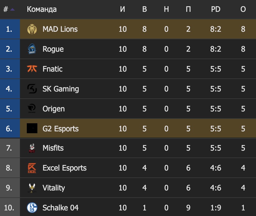 - MAD Lions лидирует с 8 победами в 10 матчах.
