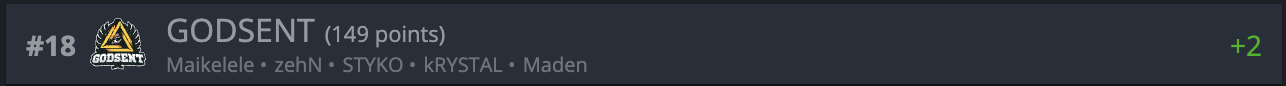 В текущем составе сыграли 159 карт, 93 из которых были выиграны, а 66 — проиграны. Соотношение убийств и смертей составляет 1.02. Рейтинг игроков kRYSTAL и Maikelele составляет 0.83 и 0.97. У maden и zehN — 1,06, а у STYKO 1.07. Они превосходят G2 в рейтинге, и они могут не отставать от французов на картах, которые обычно успешно играют шведы. Также интересно, что ключевые игроки GODSENT более опытны, хотя уступают в мировом рейтинге G2.
