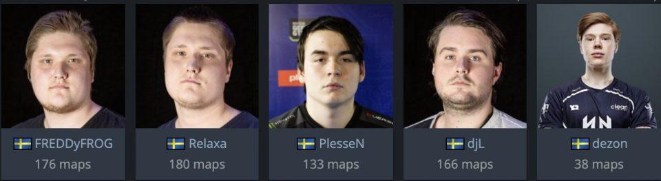 Шведская команда сыграла 182 карты. Рейтинг большинства игроков выше 1.0. У PlesseN 1.11, Relaxa 1.12, FreddyFrog 1.20. В этом они превосходят своих соперников.