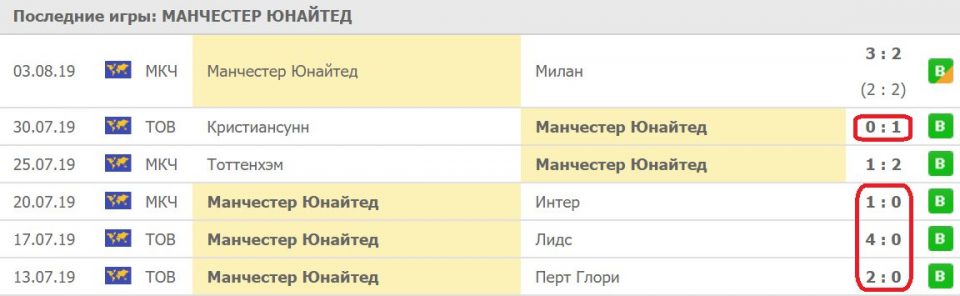 Исход «МЮ не проиграет и ТБ(1.5)» прошел против «Тоттенхэма» и «Милана». В контрольных встречах «красные» крайне редко пропускали: четыре матча — «сухие» ворота.