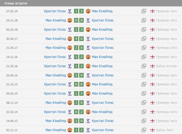 Главный критерий текущей ставки — личные поединки. Английские первенства встречались 47 раз: 31 победа у «красных дьяволов» и всего лишь 6 у «Кристала Пэласа». Самая крупная победа «красных» — 4:0.