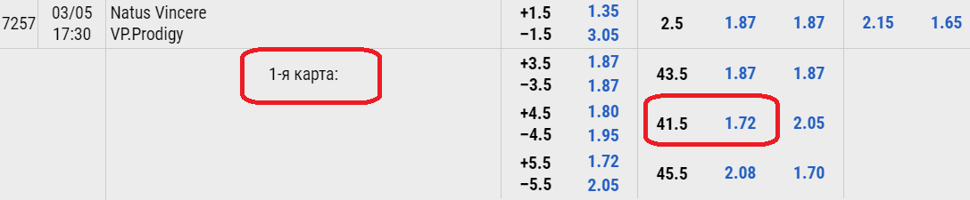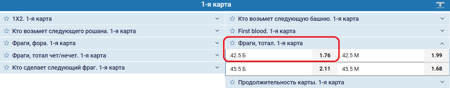 ВАЖНО ЗНАТЬ! На данный момент ставку 1-я карта: ТБ(42.5) сможете найти на БК 1хСтавка. Конторы Winline, ЛигаСтавок, Фонбет, LeonBets не выставляют такой исход.