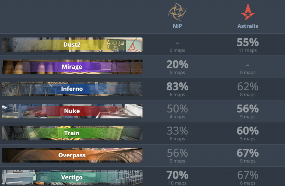 Первым пиком Astralis в настоящее время является Nuke, где выиграно 5 из последних 9 матчей. Первая карта, от которой по всей видимости откажутся датчане, станет Mirage. За последние 3 месяца они на ней не играли и велика вероятность, что забанят ее снова. Хотя для NiP эта карта не является сильной — лишь 20% побед.