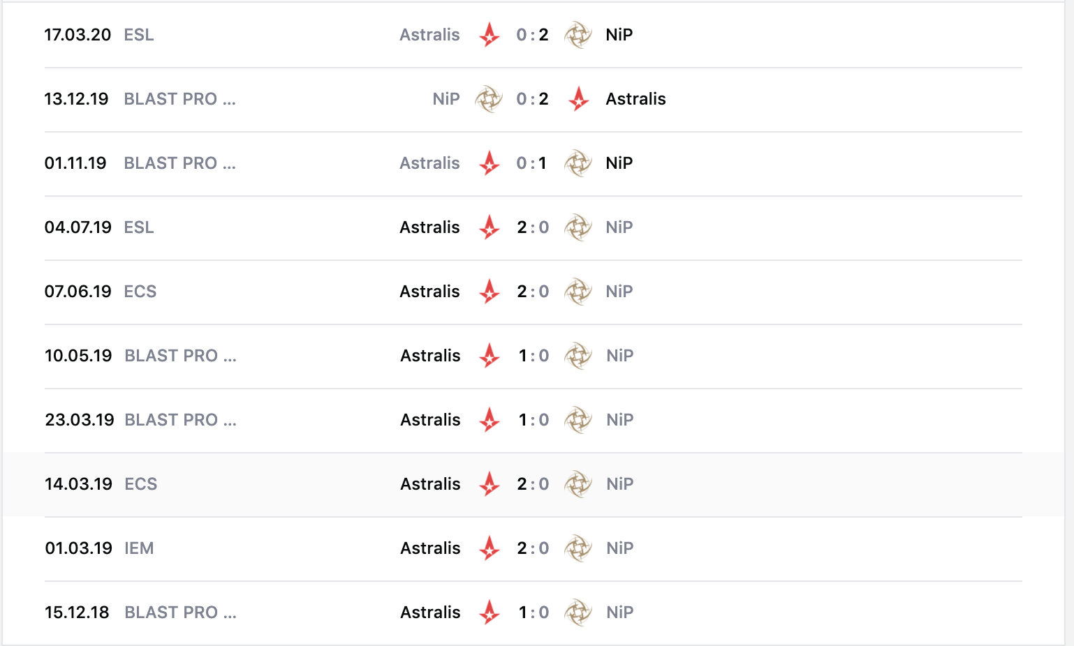 Совсем недавно NiP сенсационно обыграли Astralis на ESL Pro League со счетом 2-0, когда шли в линии явным аутсайдером. На Vertigo и Overpass прошло то противостояние. Однако, из последних 11 встреч 9 завершились победой Astralis, причем они выиграли 80% карт, и поэтому датчане по праву считаются явными фаворитами этого матча.