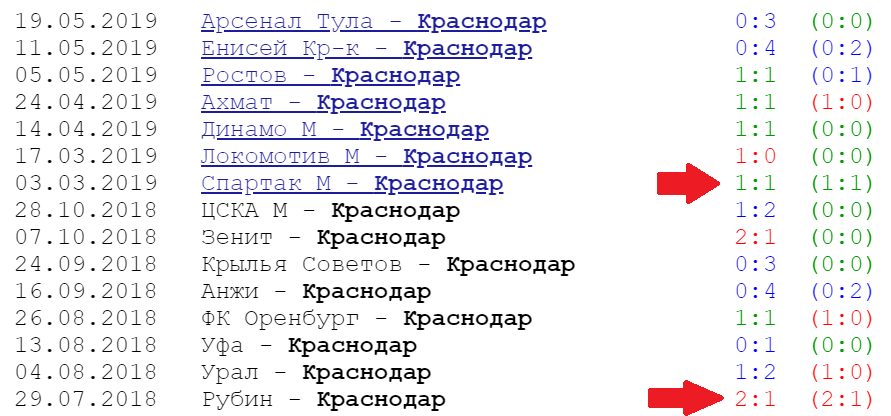 Ниже изображены результаты «Краснодара» на выезде в прошлом сезоне чемпионата России. Статистика ставки «второй тайм: ТБ(1.0)» (всего 15 встреч): 8+, 5 возврата и 2 минуса.