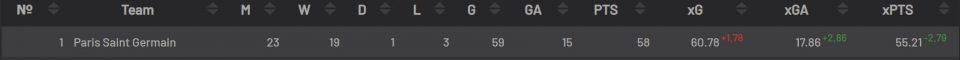 Обратите внимание на изображение: не наблюдается сильных отклонений показателей xG, xGА и xPTS. 59 голов (60.78), 15 пропущенных (17.86) и 58 очков (56.21).