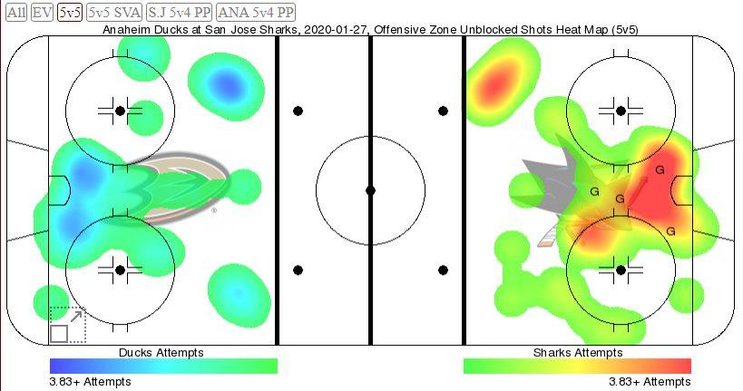 Тепловая карта бросков также наглядно демонстрирует преимущество Акул. Обратите внимание, сколько бросков нанесли хоккеисты «Сан-Хосе» из опасных зон. При этом пятак и другие опасные зоны вблизи ворот «Сан-Хосе» совсем тусклые на тепловой карте.
