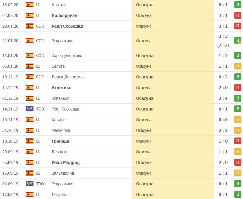 Испанский коллектив испытывает такие же проблемы, что и соперник — недостаточно созданных голевых моментов и их слабая реализация. «Осасуна» располагается на 12 строчки Ла Лиги, имея 31 балл, 7 побед, 10 ничьи и 8 проигршей. Разница забитых и пропущенных голов 31-35.