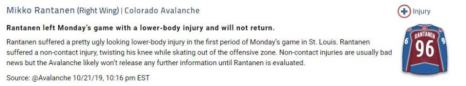 «Колорадо» получил удар в виде травмы Рантанена, поскольку он входит в ударное сочетание атаки с Маккинноном и Ландескугом.