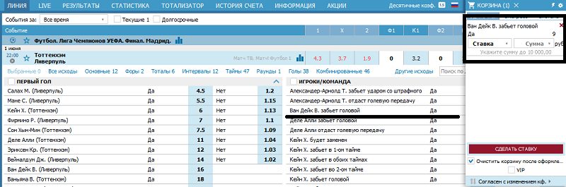 - Индивидуальные ставки на конкретного игрока, к примеру, на гол защитника «Ливерпуля» Вирджила Ван Дейка в финале Лиги Чемпионов и прочее.