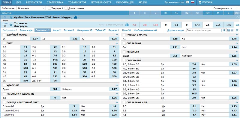 | Букмекер | Глубина росписи на примере матча Финала Лиги Чемпионов «Тотенхэм» - «Ливерпуль» | Букмекерская маржа на примере матча Финала Лиги Чемпионов «Тотенхэм» - «Ливерпуль» | Статистика команд | Статистика очных противостояний | Турнирная таблица | Видеотрансляция/текстовая трансляция |