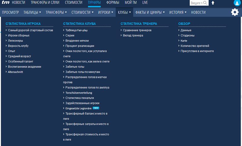 Transfermarkt. Сайт, который изначально создавался как база футболистов всех лиг. Сейчас на этом ресурсе можно найти сведения о проценте реализации голевых моментов интересующей команды, временных интервалах, на которых были забиты голы, статистику по одиннадцатиметровым ударам и многое другое.
