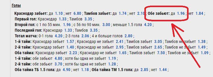 По правилам стратегии BTTS (Both teams to score) необходимо проанализировать для каждой команды как часто проходила ставка «Обе забьют» в 10 последних встречах. У «Краснодара» — 9 игр (90%), «Тамбова» — 7 (70%).