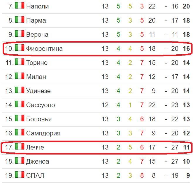 Средние значения двух показателей «Лечче» > «Фиорентины». 90% игр «волков» закончились, где оба показателя больше числа 0.90!