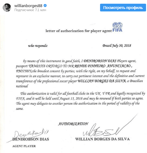 Виллиан сегодня сообщил в социальных сетях, что официальный документ, фотография которого активно разлетелась по британским и испанским СМИ, является подделкой. Бразилец признался, что никогда не подписывал ничего подобного и будет обращаться в суд, чтобы урегулировать этот вопрос. По словам Виллиана, он беспокоится, что подобные инциденты будут продолжаться и в будущем с более важными бумагами, тем самым разрушая репутацию футболиста и провоцируя на еще более громкие судебные дела.