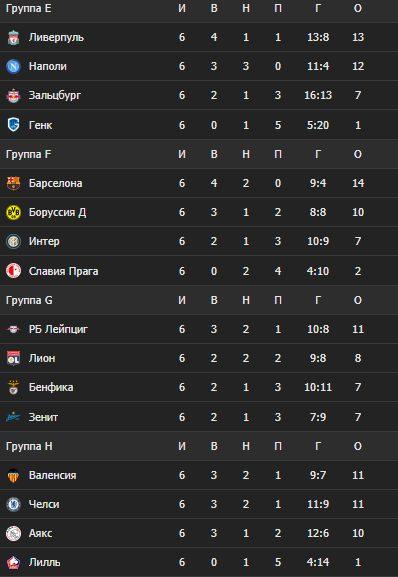 «Ливерпуль», «Наполи» и «РБ Зальцбург» сохраняли шансы на выход в плей-офф. «Наполи» в домашнем матче с «Генком» воспользовался своим шансом сполна, отправив в ворота гостей 4 безответных мяча. И сразу же тренер неаполитанцев Карло Анчелотти после крупной победы был отправлен в отставку.
